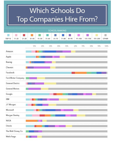 从图中我们不难看出,美国各行业大牛公司其员工基本都来自于美国排名前200的大学。Facebook和谷歌从美国排名前200位的学校招聘了超过80%的员工,超过一半的Facebook员工毕业于前10名大学。而接近50%的亚马逊员工是从美国世界级学校排行榜的前100名的大学中招聘的,约10%的员工来自前10名大学。