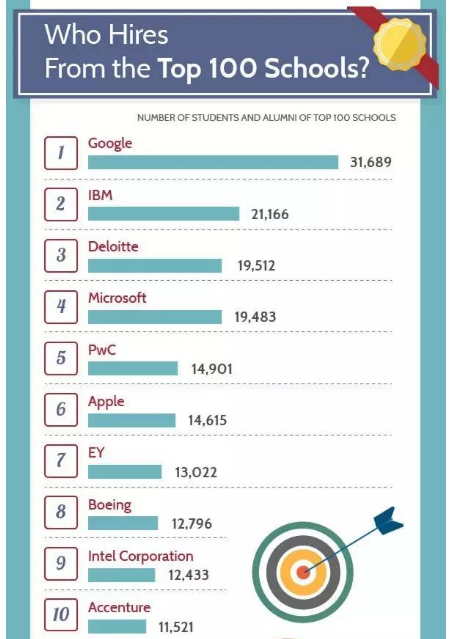 在排名前100的学校中,谷歌拥有最多来自于Top100学校的校友——31,689名,其次是IBM、德勤和微软等公司。并且,有趣的是,像IBM、德勤、微软这样的世界级公司不仅仅喜欢排名前列学校的学生,某些party school的毕业生也很受青睐,毕竟学习生活两不误的人往往有着过人的才能。