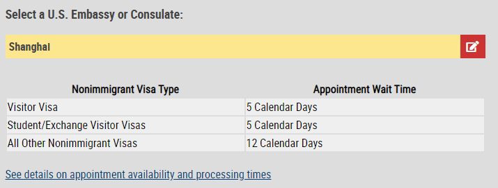上海领事馆预约等待时间为5天,其他非移民类签证的预约等候时间为12天;